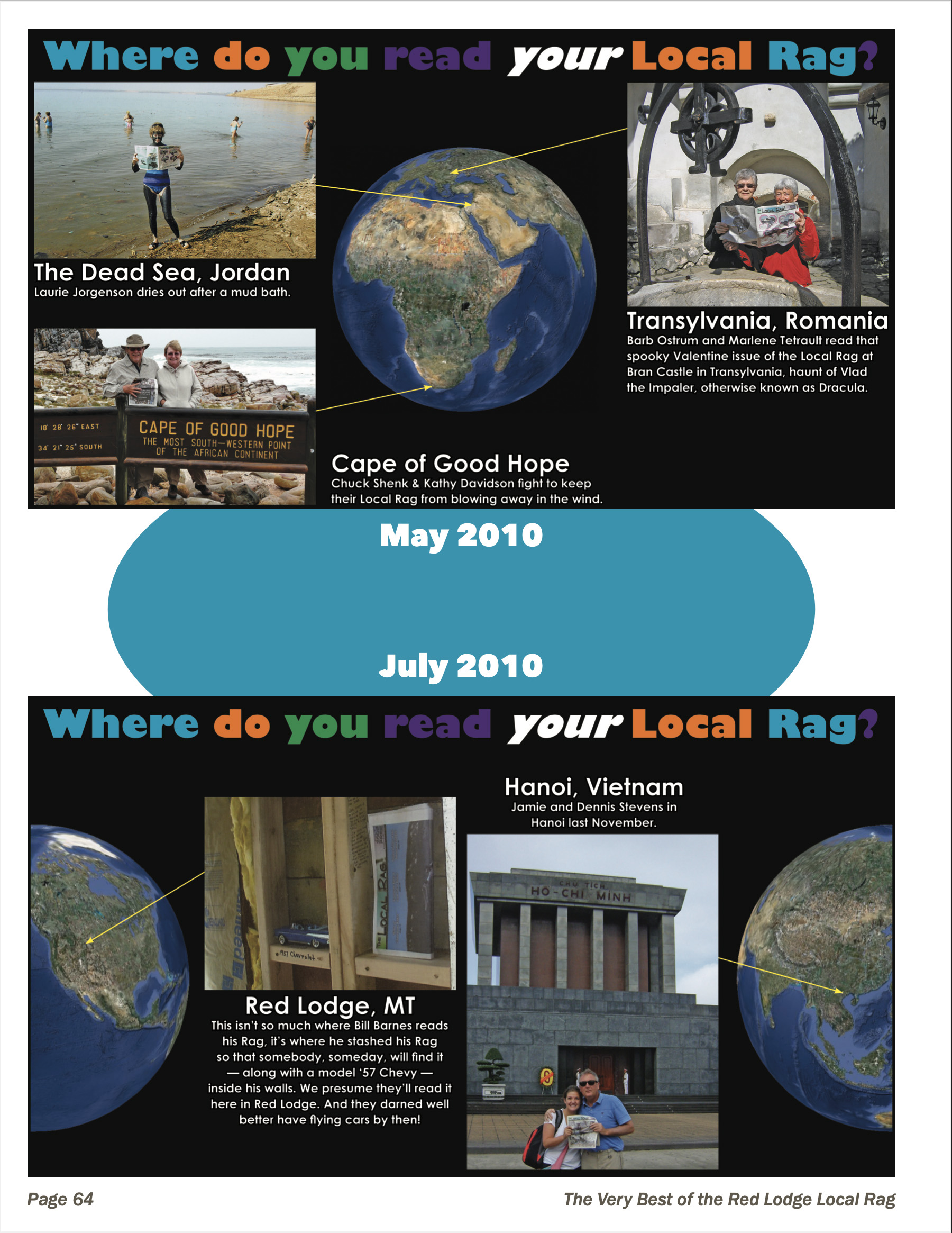 The entire book is printed in color, with a mix of scanned content from older papers and crisp fresh images from newer ones. Robson has pulled together features from all six editors, including the wildly popular “Where do you read YOUR Local Rag,” where readers submitted pictures of themselves reading the Rag in 50 countries, spanning all seven continents.